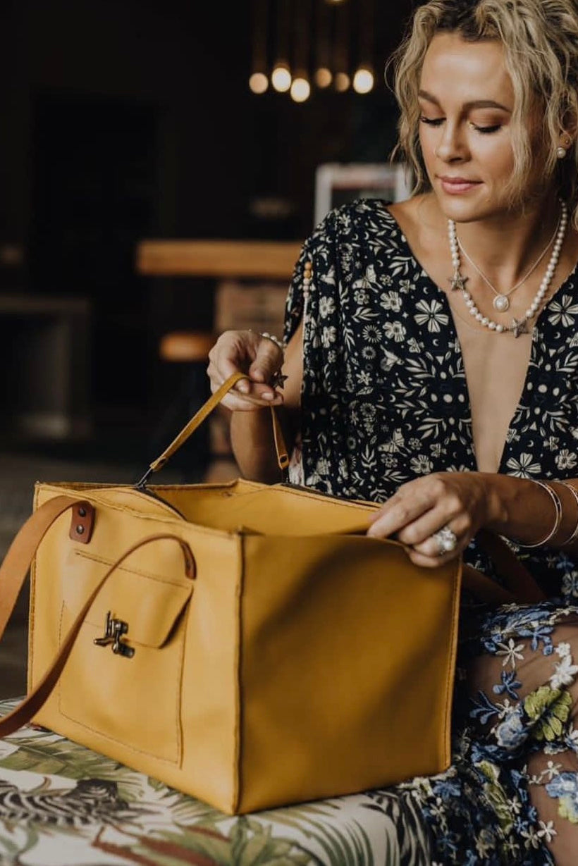 It has sturdy straps made with tan leather and a removable plastic container inside. We've made an open option and closed option available, which includes a flap to seal the case at the top.